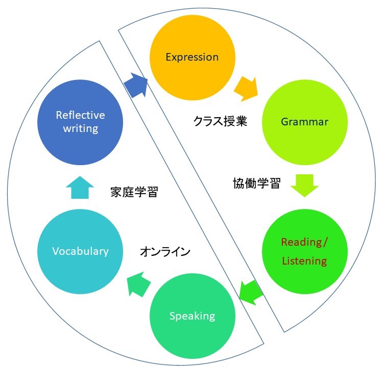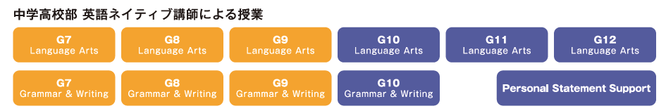 インター校に通っている生徒や帰国生は、グローバル英語クラスでネイティブ講師による授業、日本の学校に通っている生徒は、日本人講師による文法やリーディングの授業と、ネイティブ講師・帰国生とのオンラインレッスンを組み合わせて、英語力を伸ばします。
