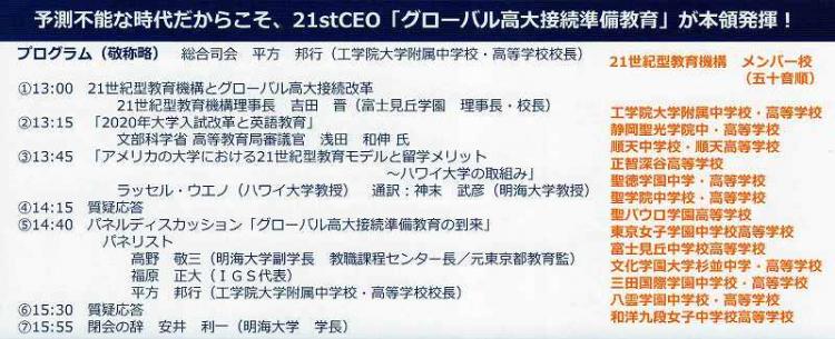 • 浅田和伸氏は、現職の文科省審議官の立場から、国民全体の英語スタンダードをどう高めていくか、また、社会構造の変化に対応するにはどのような高大接続が望ましいのかというお話、一方、パネルディスカッションにおいてIGS代表の福原正大氏は、第4次産業革命をサバイバルし、日本を牽引していけるグローバルエリートをどう育てていくかという観点が際立っていました。21世紀型教育機構のスタンスは、理事長の吉田晋先生や工学院校長の平方先生のお話に垣間見えていたように、グローバル市民と創造的才能者の活躍できる社会の実現ということでしょうか。それぞれの立場から日本の教育を変えていこうとする熱気が会場を包んでいました。